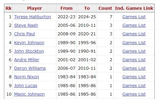 哈利伯頓8次打出20+15助+0失誤 比保羅魔術(shù)師斯托克頓總和還多