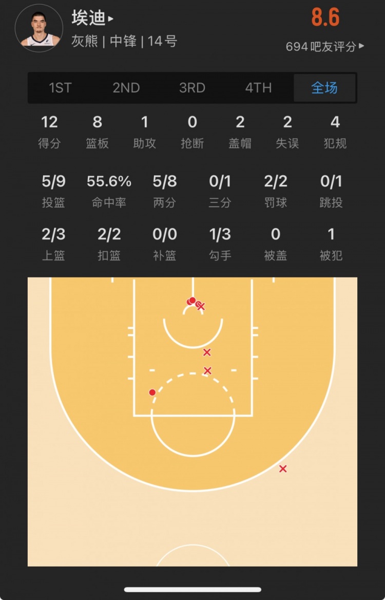 灰熊9號(hào)秀 扎克-埃迪 登場(chǎng)27.2分鐘