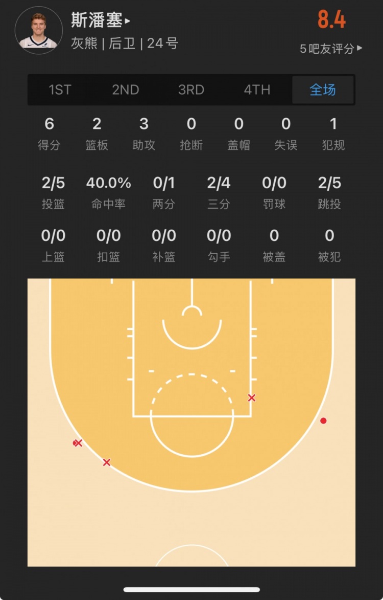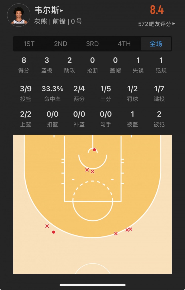 灰熊39號(hào)秀 杰倫-韋爾斯 登場(chǎng)26.1分鐘