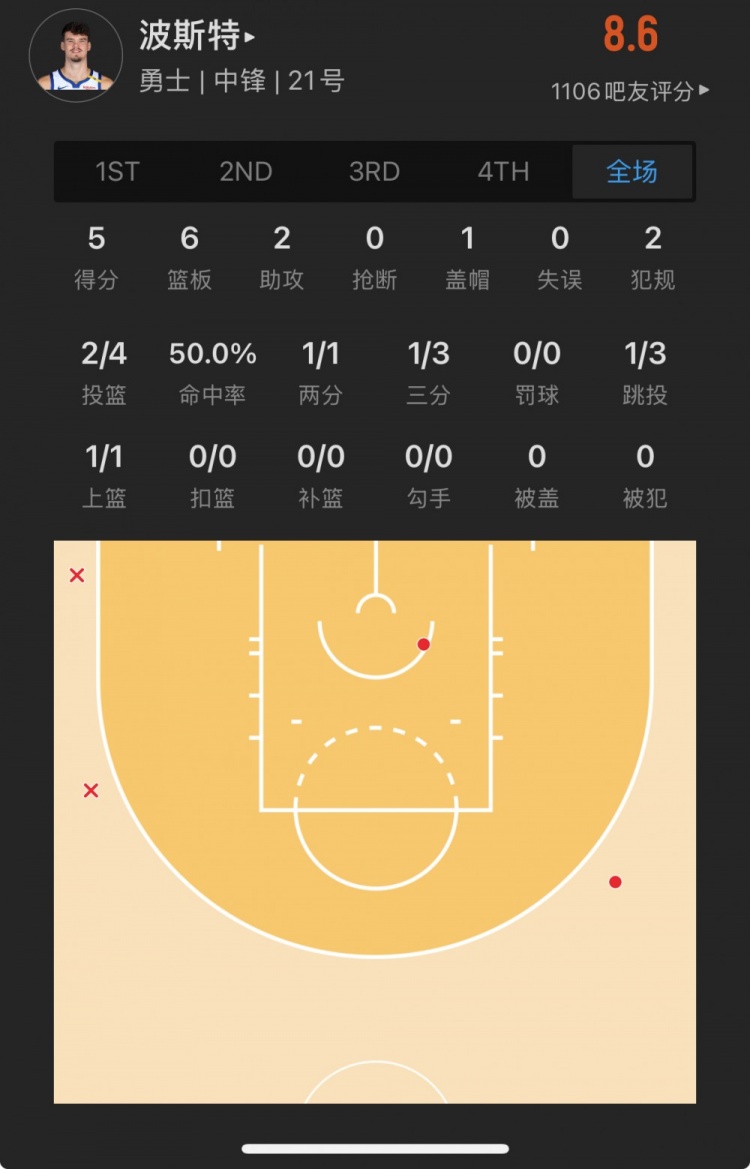 勇士52號(hào)秀 昆滕-波斯特 登場(chǎng)19.4分鐘