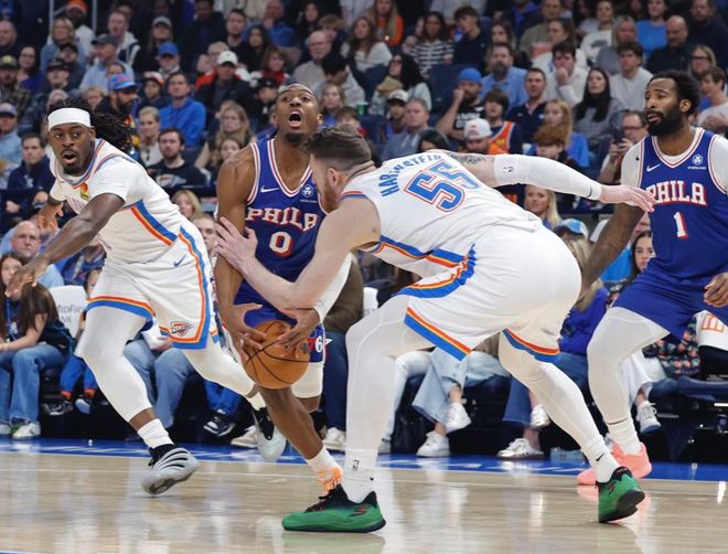 易邊再戰(zhàn),雷霆開始發(fā)力,亞歷山大和霍姆格倫狀態(tài)火熱,帶隊打出一波11-0攻勢,76人麥凱恩和格萊姆斯相繼命中三分止血,可還是無法阻擋雷霆攻勢,三節(jié)打完已經(jīng)落后16分。末節(jié)上來76人進攻狀態(tài)依然慘淡,5分鐘僅得3分,雷霆則把握住機會,轟出一波12-3攻勢將分差進一步拉開,比賽也就此失去懸念,最終用一場25分大勝終結(jié)頹勢。